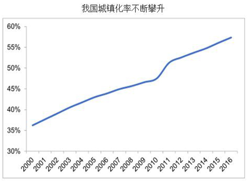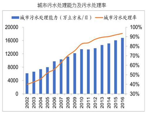 近几年,我国城镇化发展很快,城镇化率已从2000年的36.22%提高到了2016年的57.35%,2020年我国常驻人口城镇化率要达到60%,2030年达到70%,距离欧美等发达国家80%以上的城镇化率还有很长一段路要走。因此未来一段时间内城镇生活污水排放量仍将保持5%左右增速增长。