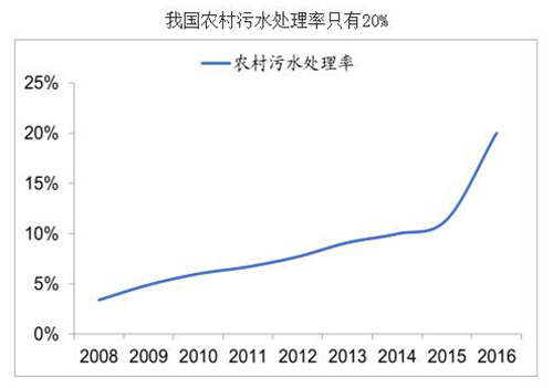 与城市和县城污水处理市场不同,我国村镇地区污水处理设施不完善、污水处理率严重不足。2008年,我国只有3.4%的行政村对生活污水进行了处理,2016年末这一数据虽然上升到20%,但远远低于城市93.44%和县城87.38%的处理率。另一方面,2016年末有68.7%的行政村有集中供水,65%的行政村对生活垃圾进行处理,污水处理远远滞后集中供水和垃圾处理。
