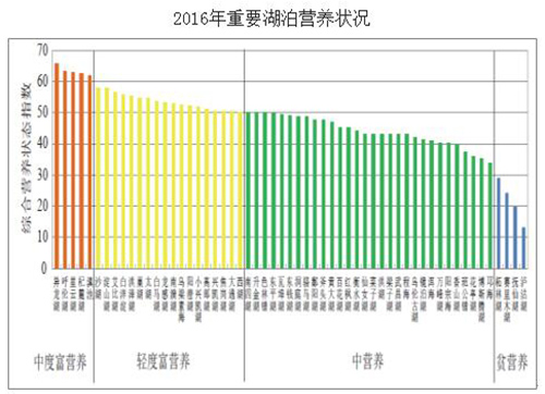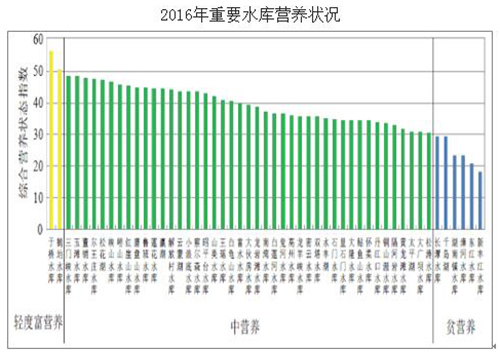 湖泊水库方面:112个重要湖泊(水库)中,Ⅰ类水质的湖泊(水库)8个,占7.1%;Ⅱ类28个,占25.0%;Ⅲ类38个,占33.9%;Ⅳ类23个,占20.5%;Ⅴ类6个,占5.4%;劣Ⅴ类9个,占8.0%。108个监测营养状态的湖泊(水库)中,贫营养的10个,中营养的73个,轻度富营养的20个,重度富营养的5个。
