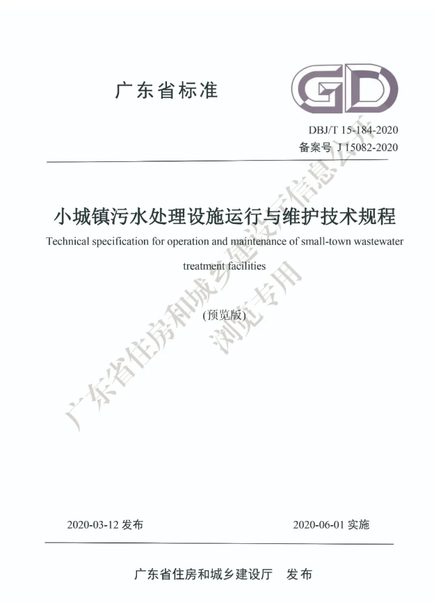 为贯彻《中华人民共和国环境保护法》、《中华人民共和国水污染防治法》、《广东省环境保护条例》等法律法规,提升城乡污水治理水平,规范小城镇污水处理设施运行、维护过程,确保设施有效、稳定、安全运行,充分发挥处理设施的使用功能。广东省正加快城乡污水处理设施的建设,为更好地开展建设工作,广东省住房和城乡建设厅发布了《小城镇污水处理设施运行与维护技术规程》,并于2020年6月1日起实施。