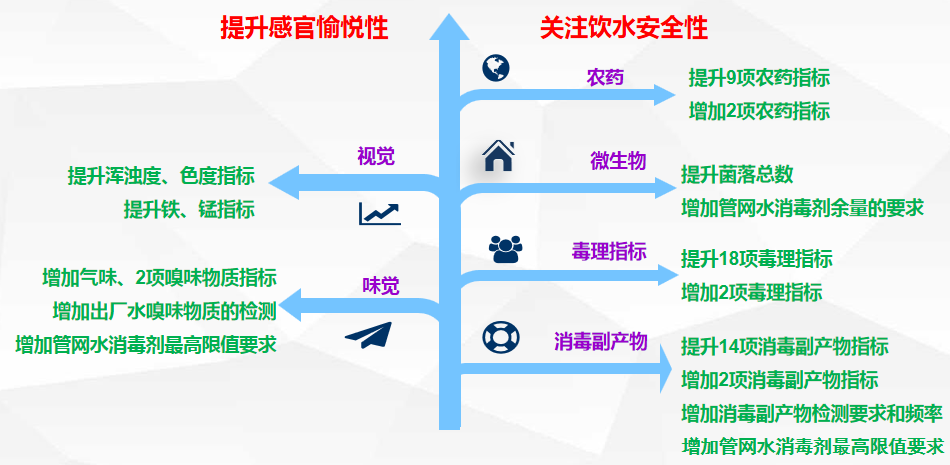 深圳市《生活饮用水水质标准》与国家现行标准相比,增加了10项指标,提升了52项指标(含消毒剂);附录由原来的28项增加到45项;考核方法上提升了出厂水和管网水合格率要求,增加了嗅味物质和消毒副产物的检测,重点关注龙头水水质。