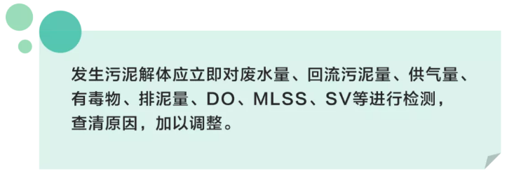 当污泥处理系统出现处理水质浑浊、污泥絮凝体细化、处理效果变坏时,即为污泥解体现象。可能是运行不当,曝气过量,营养平衡遭破坏或是废水混入有毒物质使微生物受到伤害而引起污泥解体。
