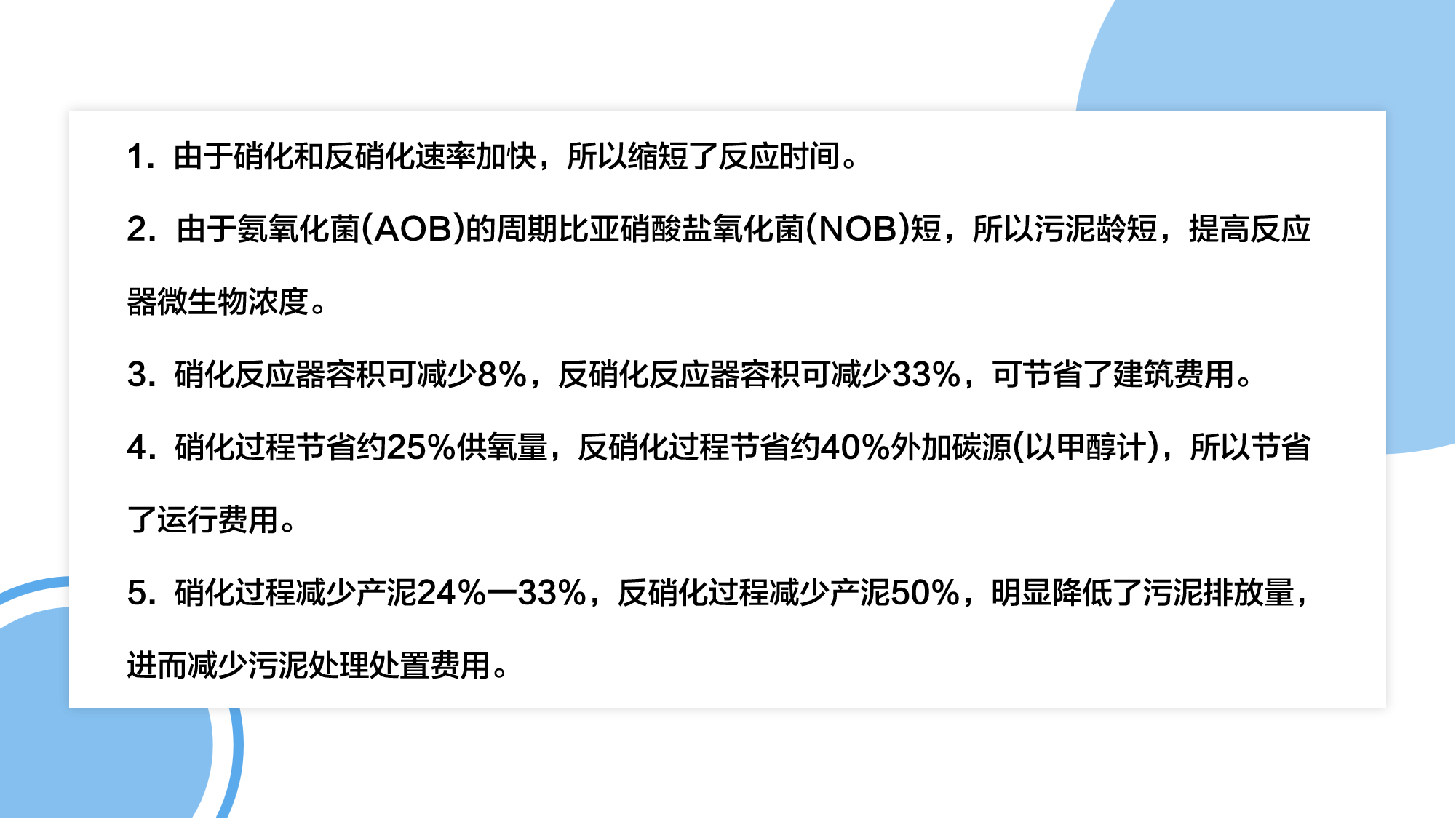 污水生物脱氮,一般由硝化和反硝化两个过程完成,而硝化过程分为氨氧化阶段和亚硝酸盐氧化阶段。这两个阶段分别由氨氧化菌(AOB)和亚硝酸盐氧化菌(NOB)独立催化完成。第一阶段是在AOB的作用下,将氨氮氧化为亚硝态氮;而第二阶段是在NOB的作用下,将亚硝态氮氧化为硝态氮。由于硝化反应是由两类生理特性完全不同的细菌独立催化完成的不同反应,所以需要通过适当控制条件,可以将硝化反应控制在亚硝态氮阶段,阻止亚硝态氮的进一步氧化,随后直接进行反硝化,这就是短程硝化反硝化的作用机理。