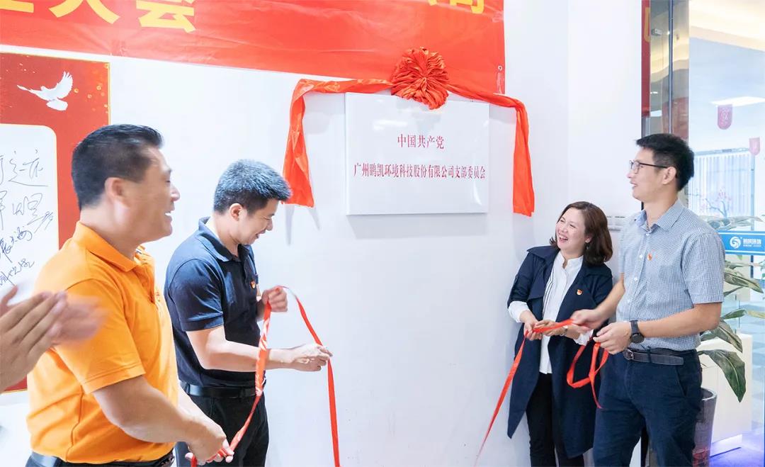 陈瑞梅同志、陈俊锋同志、周世武同志、王国彬同志共同为鹏凯环境党支部揭牌,开启鹏凯环境党建启航发展的新篇章。