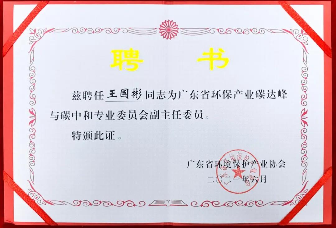 鹏凯环境王国彬董事长聘任为为广东省环保产业碳达峰与碳中和专业委员会副主任委员