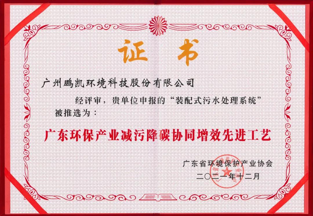 会上,广东省环境保护产业协会碳达峰碳中和专业委员会为“减污降碳协同治理先进项目”进行颁牌。鹏凯环境申报的“装配式污水处理系统”被推选为“广东环保产业减污降碳协同增效先进工艺”。
