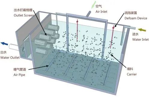 MBBR工艺是运用生物膜法的基本原理,通过向反应器中投加一定数量的悬浮载体,提高反应器中的生物量及生物种类,从而提高反应器的处理效率。由于填料密度接近于水,所以在曝气的时候,与水呈完全混合状态,微生物生长的环境为气、液、固三相。