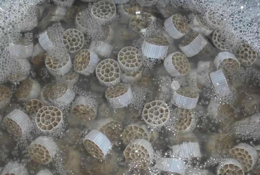 载体在水中的碰撞和剪切作用,使空气气泡更加细小,增加了氧气的利用率。另外,每个载体内外均具有不同的生物种类,内部生长一些厌氧菌或兼氧菌,外部为好氧菌,这样每个载体都为一个微型反应器,使硝化反应和反硝化反应同时存在,从而提高了处理效果。