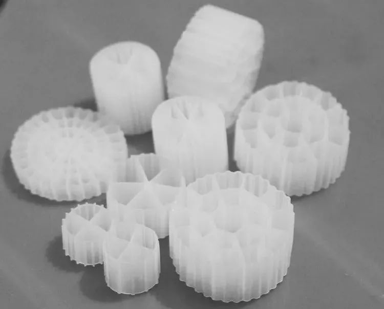 此类型的生物填料有利于微生物在填料内侧附着生长,形成较稳定的生物膜,并且容易形成流化状态。当预处理要求较低或污水中含有大量纤维物质时,例如在市政污水处理中不采用初沉池或者在处理含有大量纤维的造纸废水时,采用比表面积较小、尺寸较大的生物填料,当已有较好的预处理或用于硝化时,采用比表面积大的生物填料。