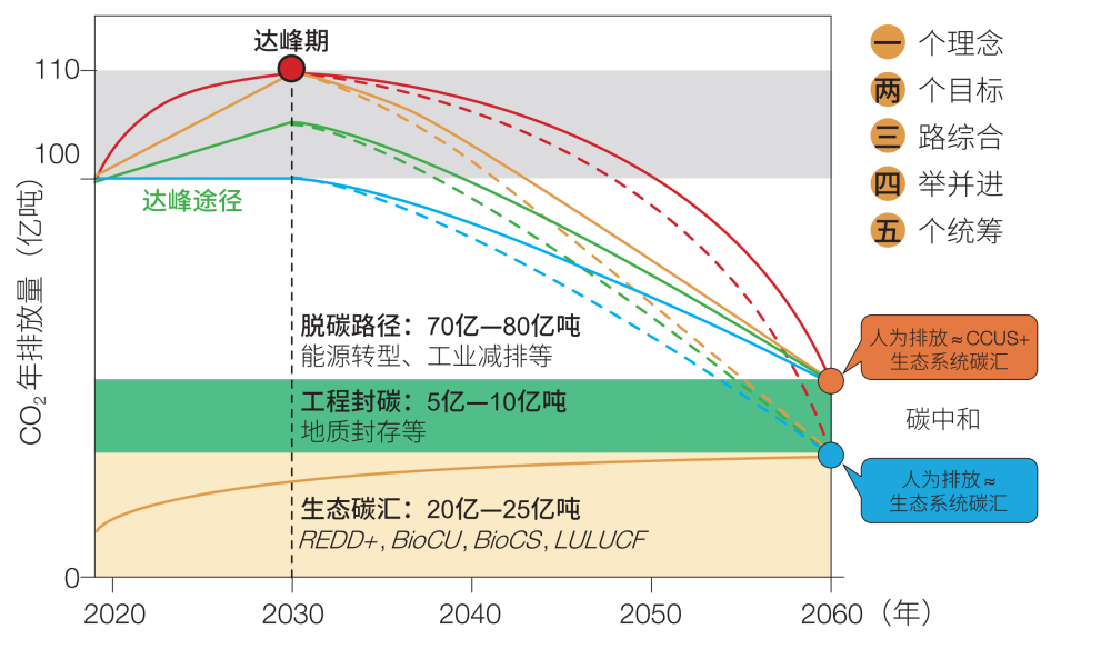 3. 人为固碳路径的生态环境治理。通过生态环境建设,土壤碳固持以及大气CCUS等组合技术和工程抵消或中和基础性的人为碳排放量。在关键性、颠覆性能源技术还没有取得突破之前,通过人为生态工程建设,巩固和提升生态系统碳汇功能,是最为行之有效、最绿色、最经济、最具规模的技术途径,还与国家生态文明建设目标高度契合,可以认为是实现“双碳”目标的“压舱石”及社会经济发展的“稳定器”。
