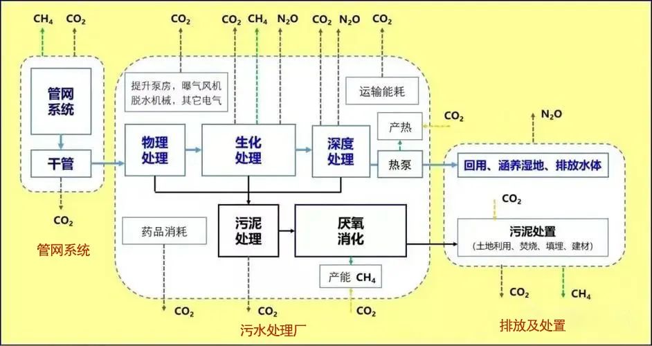 污水处理过程实际就是碳排放的过程,污水处理行业的碳排放量约占全社会总排放量的1%,在环保产业中占比最大。污水处理过程中会排放二氧化碳、甲烷和氧化亚氮。其中,二氧化碳主要来源于污水治理设施的能耗过程,而水污染物降解产生的二氧化碳则认定为生源性碳排放;甲烷主要来源于污水处理厌氧环节,包括管网、厌氧池、化粪池、污泥厌氧消化池等;氧化亚氮主要来源于污水处理过程的硝化反硝化阶段。