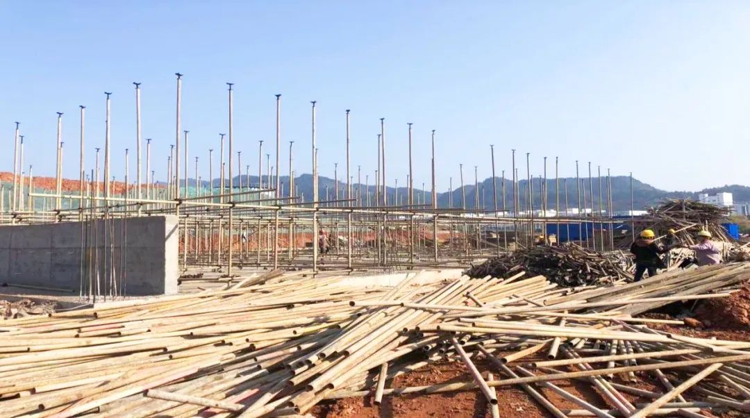 余庆项目施工现场一片热闹景象,施工机械隆隆作响,工人们正抢抓施工黄金季,进行基础建设及主体钢结构施工等作业。