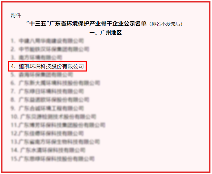 近日,“十三五”广东省环境保护产业骨干企业评选结果公布,鹏凯环境凭借卓越的科技创新能力和强劲的综合实力荣登“十三五”广东省环境保护产业骨干企业榜单。