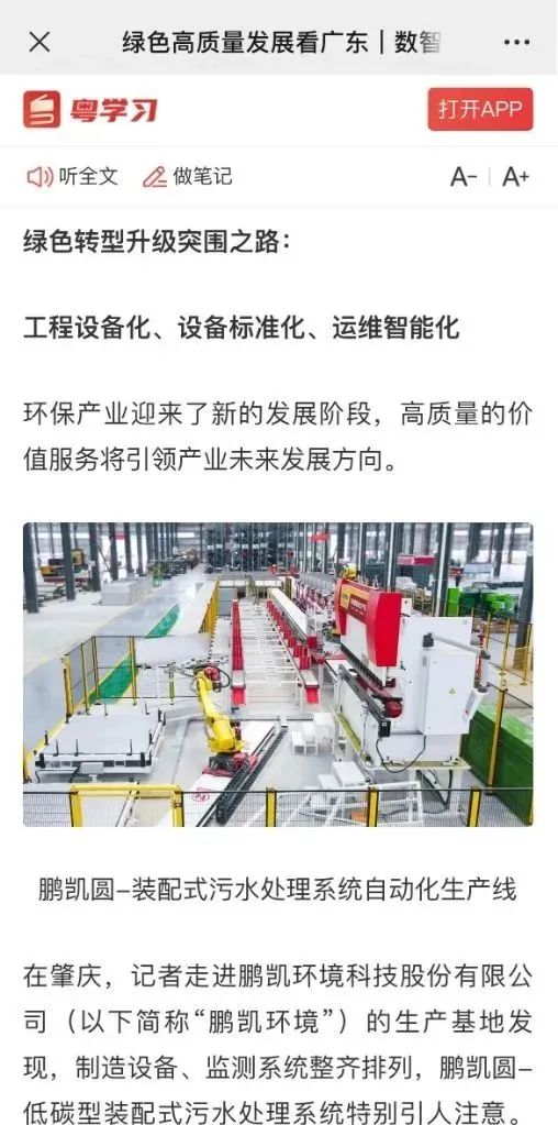 近年来,鹏凯环境作为装配式污水厂开创者及水环境治理综合服务商,始终以习近平新时代中国特色社会主义思想为指引,坚持走生态优先、绿色发展之路,把全面深化改革、绿色转型升级工作不断向纵深推进,以“工程设备化、设备标准化、运维智能化”三化模式驱动技术产品化、产品工业化、数智化转型升级,以科技创新撬动生产方式变革、企业绿色高质量发展,激发了发展新动能,走出了一条具有鹏凯特色的绿色高质量发展之路。