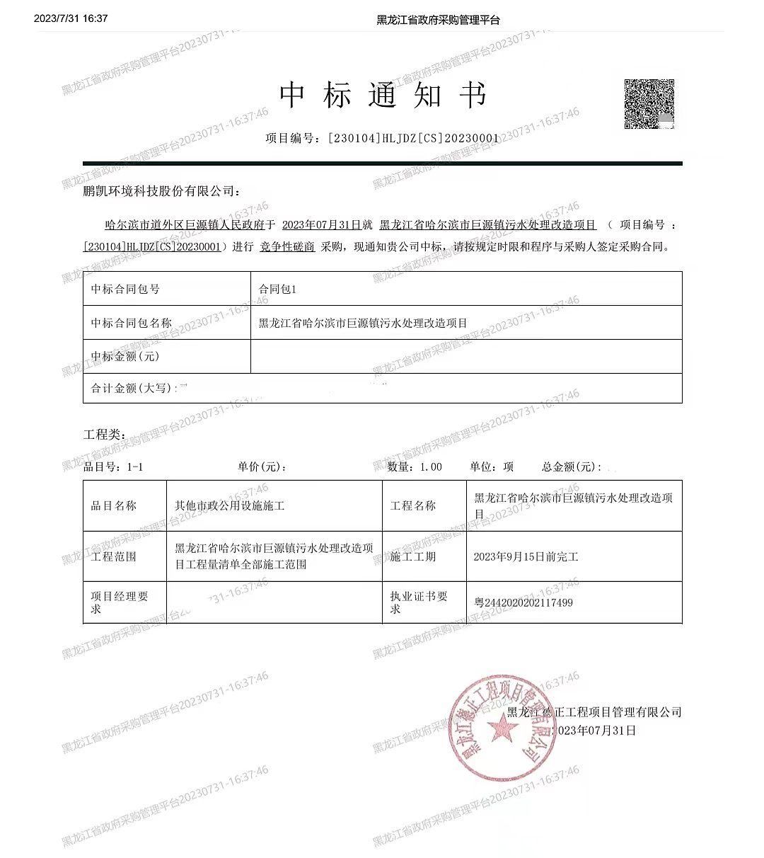 2023年已悄然过半,但火热之夏正当时,奋进之步不停歇!鹏凯环境从众多投标单位中脱颖而出,得到评审专家的高度认可与充分肯定,成功中标黑龙江省哈尔滨市巨源镇污水处理改造项目。