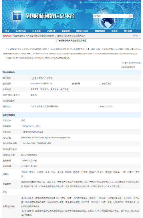 近日,由鹏凯环境科技股份有限公司(以下简称“鹏凯环境”)、中山大学等共同单位起草完成的《一体化生活污水处理设备》团体标准(T/GDAEPI 18—2023)(以下简称“《标准》”)经广东省环境保护产业协会批准正式发布!将于2023年11月29日起实施。