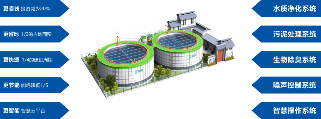 鹏凯圆主体设备呈多级环状,通过三相分离器实现水、气、污泥有效分离,并将好氧区的曝气尾气收集,作为气提动力,大幅减少能耗。其模块化、装配式的生产搭建方式可使生产质量大幅提高,建设周期大幅缩短。总的来说与传统污水厂相比:投资节省20%,只需1/3的占地面积、1/4的建设周期,能耗降低1/5。这为传统污水厂行业实现了产业升级,也将为乡村振兴高质量发展注入澎湃动能。